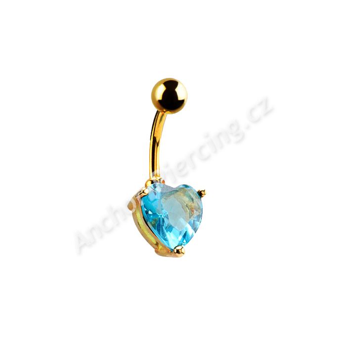 Pozlacený piercing do pupíku ve tvaru srdce se světle modrým kamínkem.
