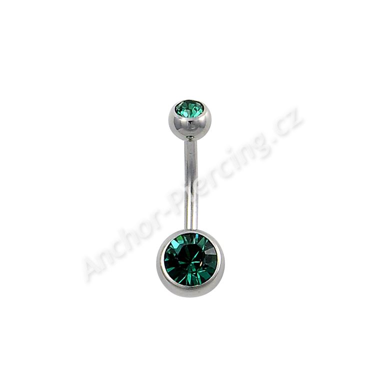 Banánek do pupíku z chirurgické ocele 316L s tmavě zelenými kamínky. U tohoto typu banánku je šroubovací pouze menší z kuliček.