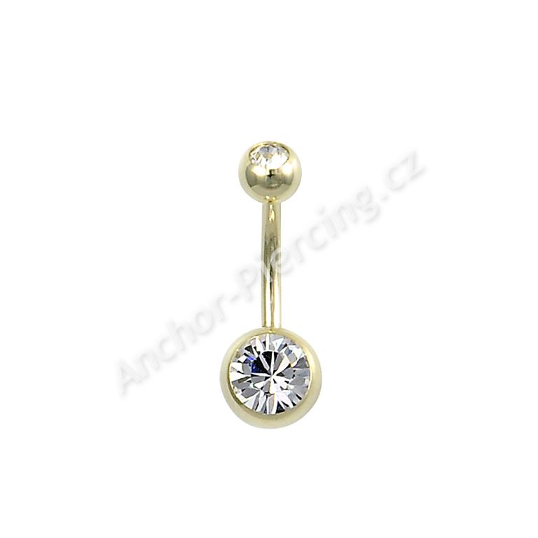 Banánek z chirurgické ocele 316L ve zlaté povrchové úpravě. Kuličky jsou osazeny kamínky a menší z kuliček je šroubovací.