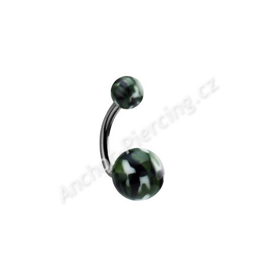 Banánek s kuličkami z akrylu na tyčce z chirurgické ocele 316L s maskáčovou texturou kuliček. Tento banánek se dá aplikovat jako piercing do pupíku.