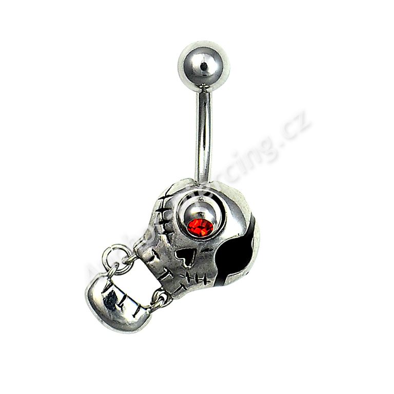 Piercing do pupíku z chirurgické ocele 316L s červeným kamínkem. Na banánku je nasazena ocelová lebka, kterou lze po odšroubování piercingové kuličky sejmout. Celková délka piercingu včetně nasazovací lebky je 30mm.