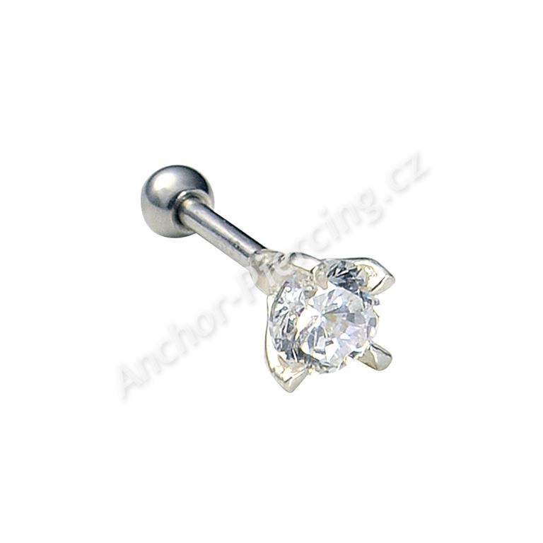 Činka z chirurgické ocele 316L v kombinaci se stříbrem. Kamen má průměr 4mm a je čiré barvy. Tuto činku lze použít na různé typy piercingů uší (tragus, conch, helix, lobe ap.).