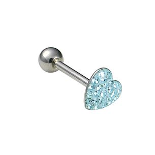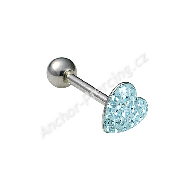 Činka z chirugické ocele s přední stranou ve tvaru srdce. Kamínky mají světle modrou barvu a jsou zalité v průhledném plastu. Kulička je u tohoto piercingu šroubovací.