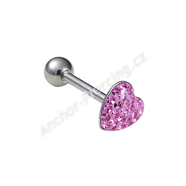 Činka z chirurgické oceli 316L s přední stranou ve tvaru srdce. Kamínky mají růžovou barvu a jsou zalité v průhledném plastu.