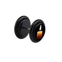 Falešný plug z akrylu. Na přední straně disku je vyobrazena hořící svíčka, po obvodu disku je natažena gumička.