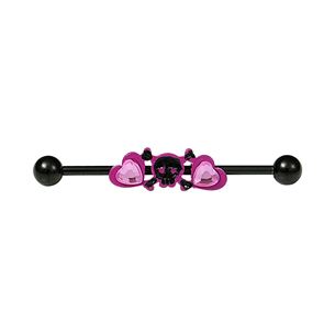 Činka z chirurgické ocele 316L v černé povrchové úpravě je vhodná pro piercing ucha zvaný Industrial. Lebka se srdíčky lze sundat a činku použít i samostatně.