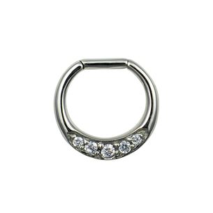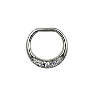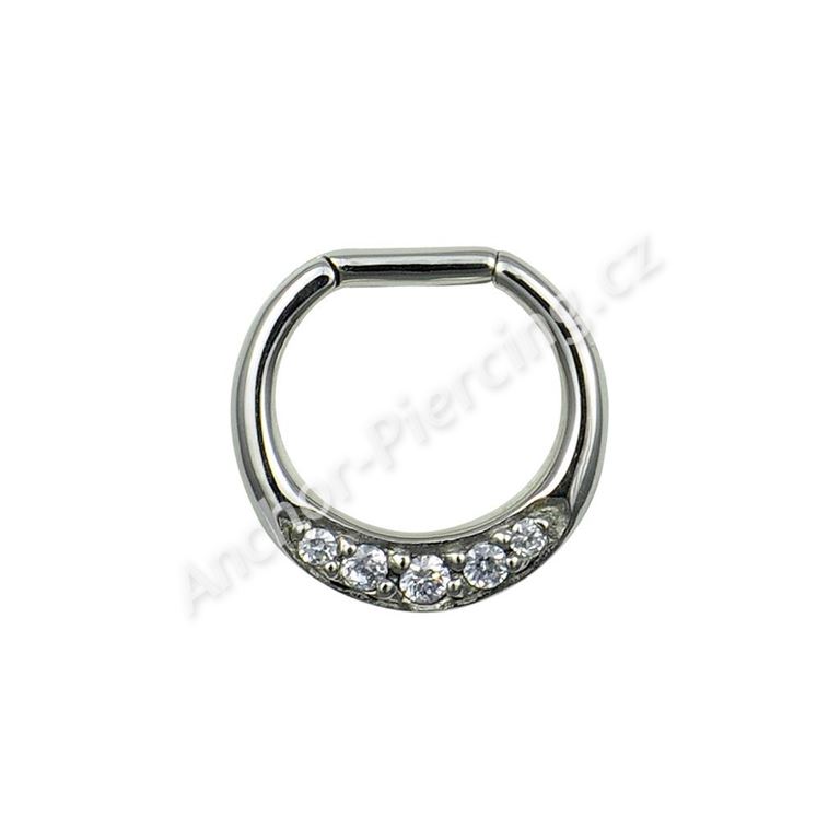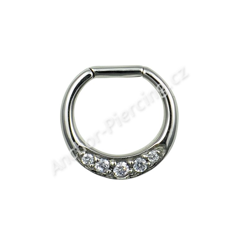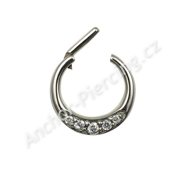 Piercing z chirurgické ocele 316L s kamínky Swarovski. Tento typ piercingu je určený pro piercing nosu (septum). Výhodou tohoto kroužku je, že jej lze otevřít rukou a není potřeba použít piercingové kleště.