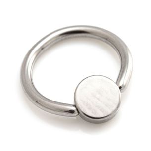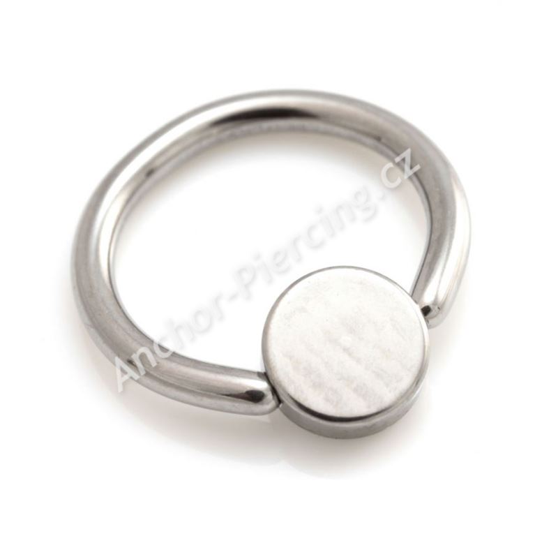 Titanový kroužek s placatým diskem. Vhodný i pro piercing úst zvaný smiley, placatý disk méně překáží než klasická kulička. Je ho možné použít i na helix, daith, septum a další.