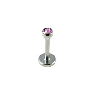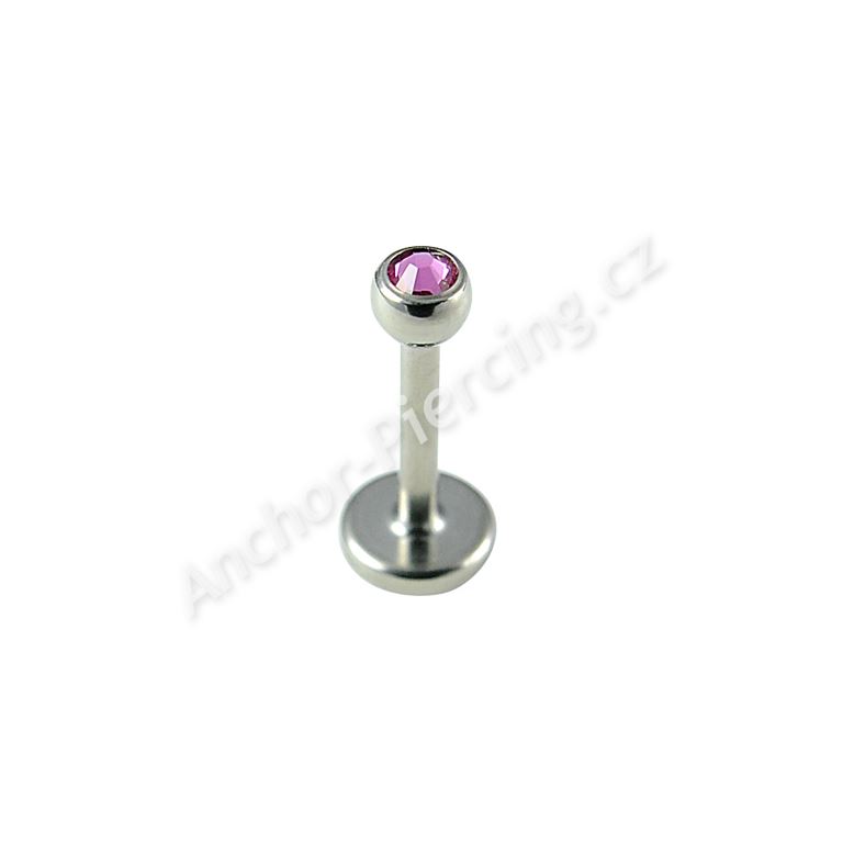 Titanová labreta s růžovým kamínkem. Tento typ piercingového šperku se nejčastěji používá pro většinu piercingů v oblasti rtů (labret, lowbret, medusa, madonna, ashley, snake bites, angel bites, dolphin bites, dahlia bites, viper bites, canine bites, cyber bites, spider bites, shark bites, cheek..), ale také na některé typy piercingu uší (lobe, tragus, helix, inner conch, outer conch, cartilage).