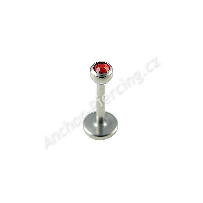 Titanová labreta s červeným kamínkem. Tento typ piercingového šperku se nejčastěji používá pro většinu piercingů v oblasti rtů (labret, lowbret, medusa, madonna, ashley, snake bites, angel bites, dolphin bites, dahlia bites, viper bites, canine bites, cyber bites, spider bites, shark bites, cheek..), ale také na některé typy piercingu uší (lobe, tragus, helix, inner conch, outer conch, cartilage).