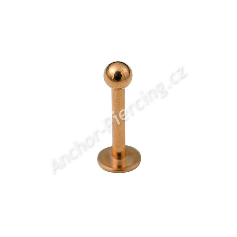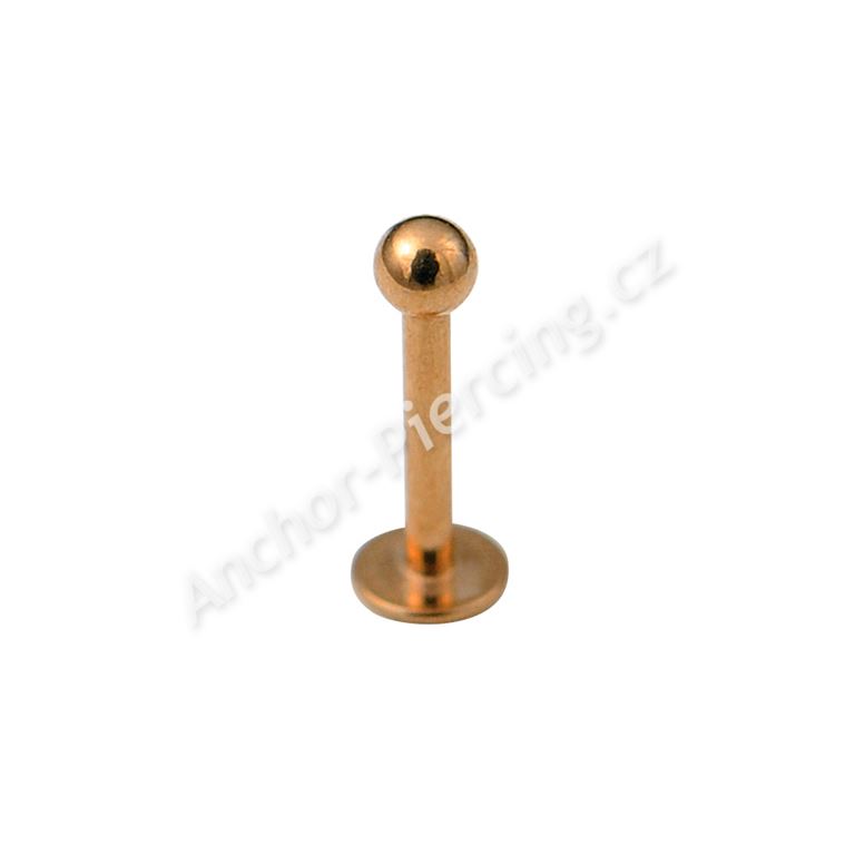 Labreta z chirurgické ocele 316L v barvě růžového zlata, se šroubovací kuličkou. Tento typ piercingového šperku se nejčastěji používá pro většinu piercingů v oblasti rtů a některé piercingy uší.