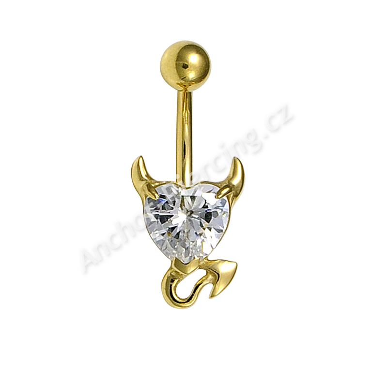 Pozlacený piercing do pupíku ve tvaru srdce s čirým kamenem.