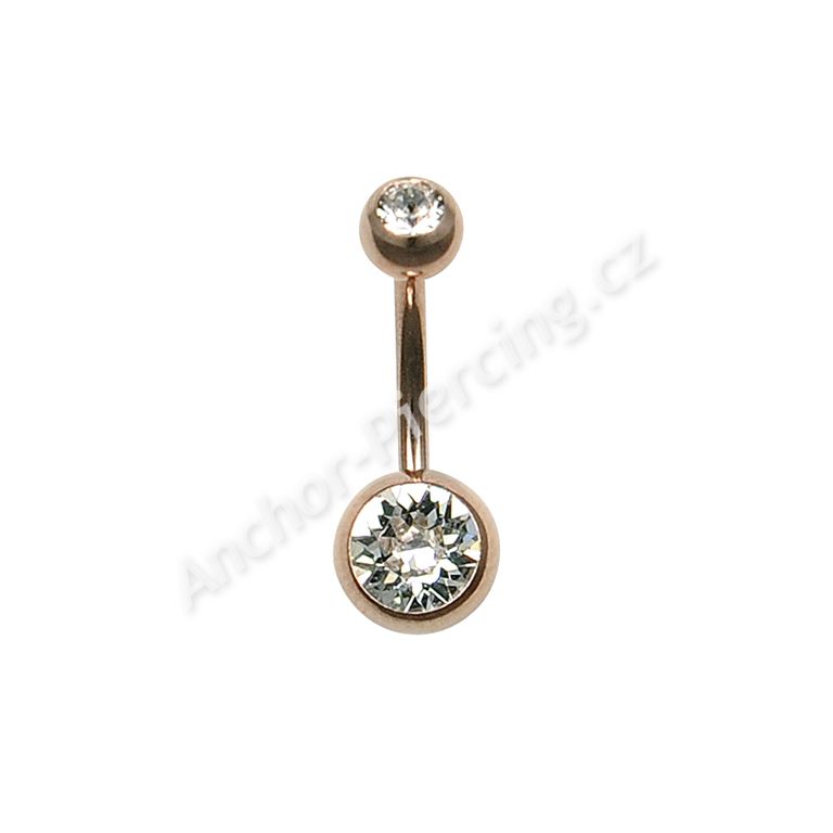 Piercing do pupíku v barvě růžového zlata s čirými kamínky.