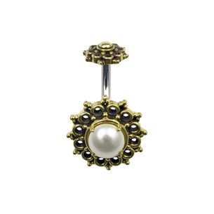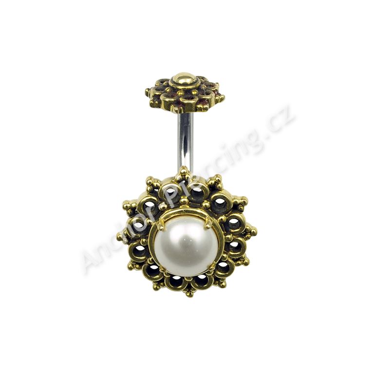 Piercing do pupíku z chirrurgické oceli 316L s mosaznou ozdobou a syntetickou perlou.