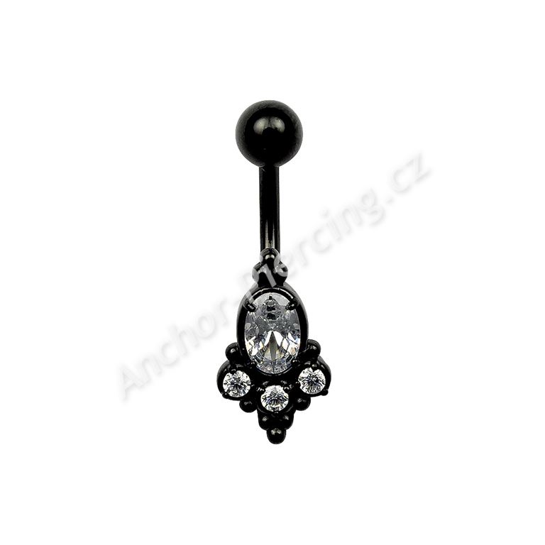 Černý piercing do pupíku z chirurgické oceli 316L s čirými kamínky.