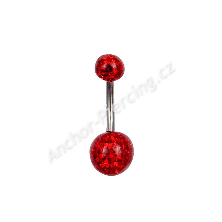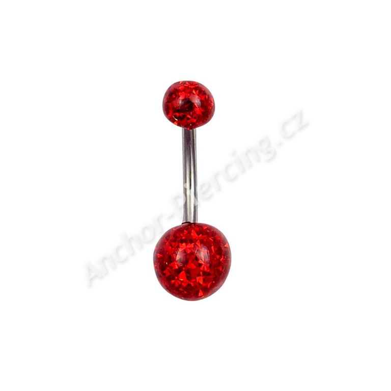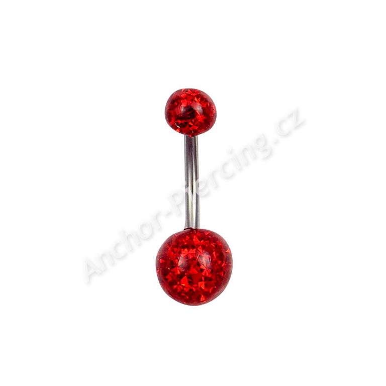 Luxusní titanový piercing do pupíku v červeném provedení. Kuličky jsou zcela hladké, protože kamínky jsou zalité v průhledném akrylu. Je tak zamezeno jejich vypadávání, ztrácení lesku a zachytávání například o oděv. Kuličky jsou obě šroubovací, mají průměr 5 a 8 milimetrů a závit typu 1.6.