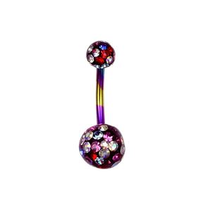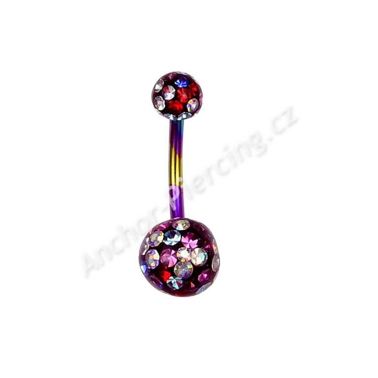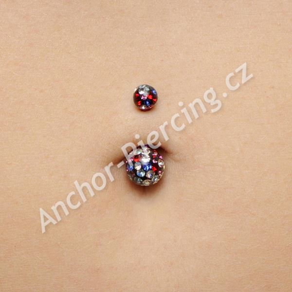 Luxusní vícebarevný titanový piercing do pupíku. Kuličky jsou zcela hladké, protože kamínky jsou zalité v průhledném akrylu. Je tak zamezeno jejich vypadávání, ztrácení lesku a zachytávání například o oděv. Obě kuličky jsou šroubovací, mají průměr 5 a 8 milimetrů a závit typu 1.6.