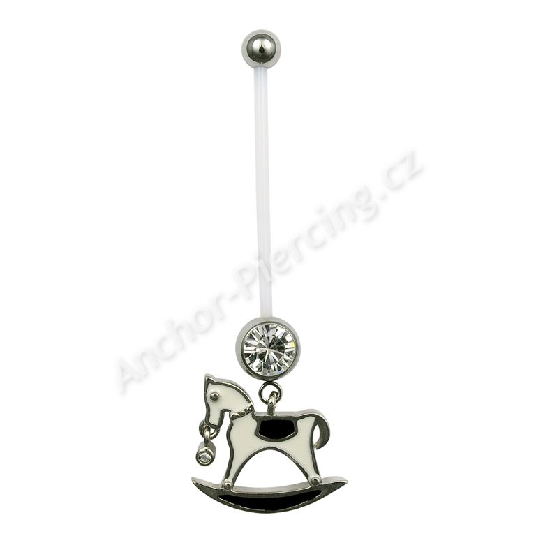 Piercing do pupíku určený pro těhotné ženy. Tyčku z bioplastu lze snadno opakovaně zkracovat, je dostatečně dlouhá aby v průběhu těhotenství na piercing tkáň příliš netlačila.