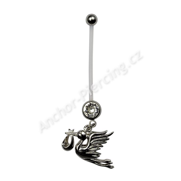 Piercing do pupíku určený pro těhotné ženy. Tyčku z bioplastu lze snadno opakovaně zkracovat, je dostatečně dlouhá aby v průběhu těhotenství na piercing tkáň příliš netlačila.