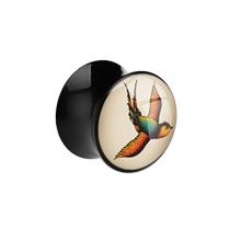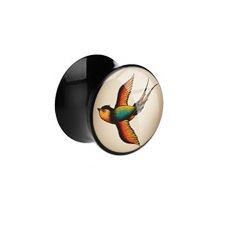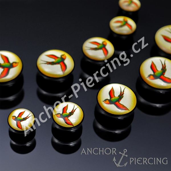 Akrylový plug s vyobrazením motivu vlašťovky. Doprodej.