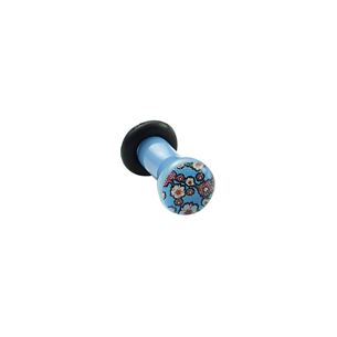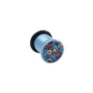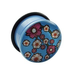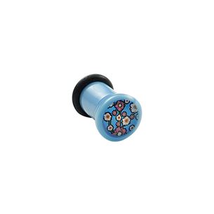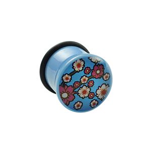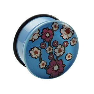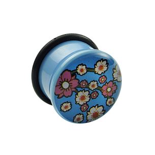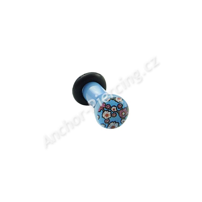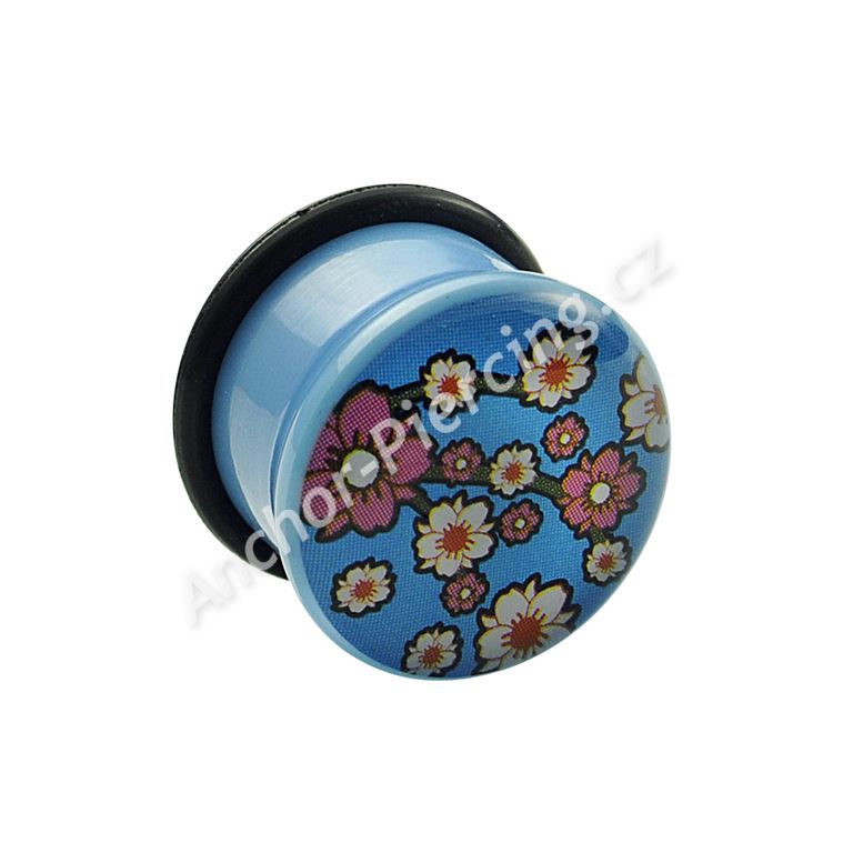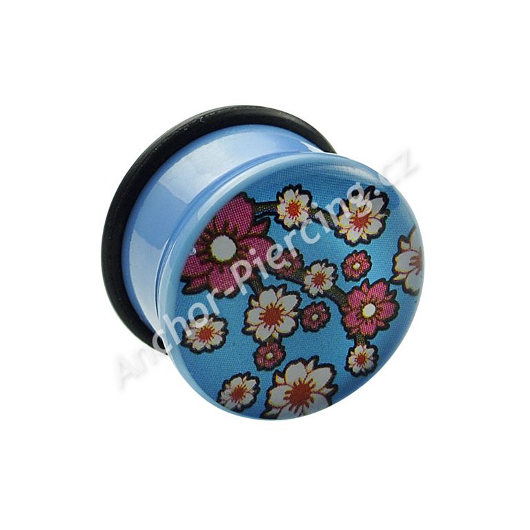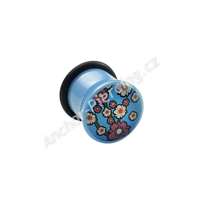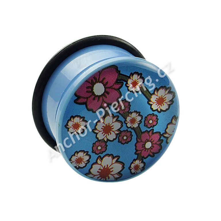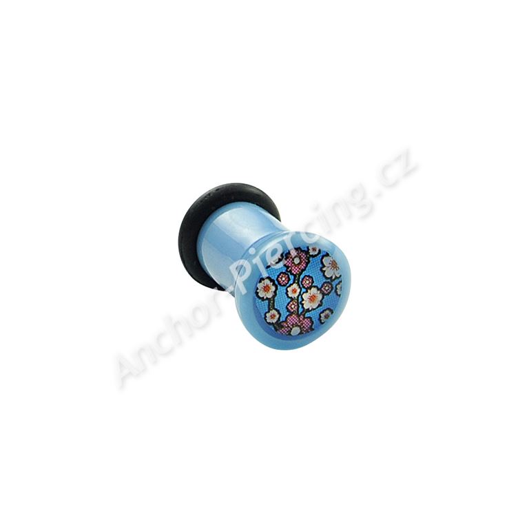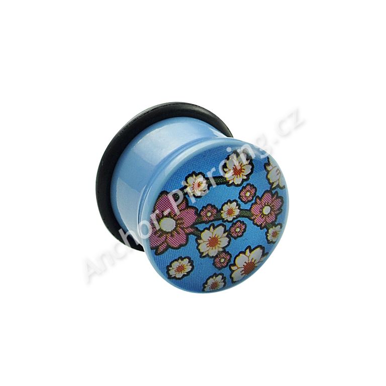 Akrylový plug světle modré barvy. Obrázek květin na přední straně je zalitý v průhledné vrstvě akrylu. Součástí balení je zajišťovací gumička.