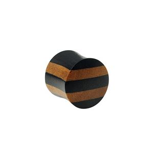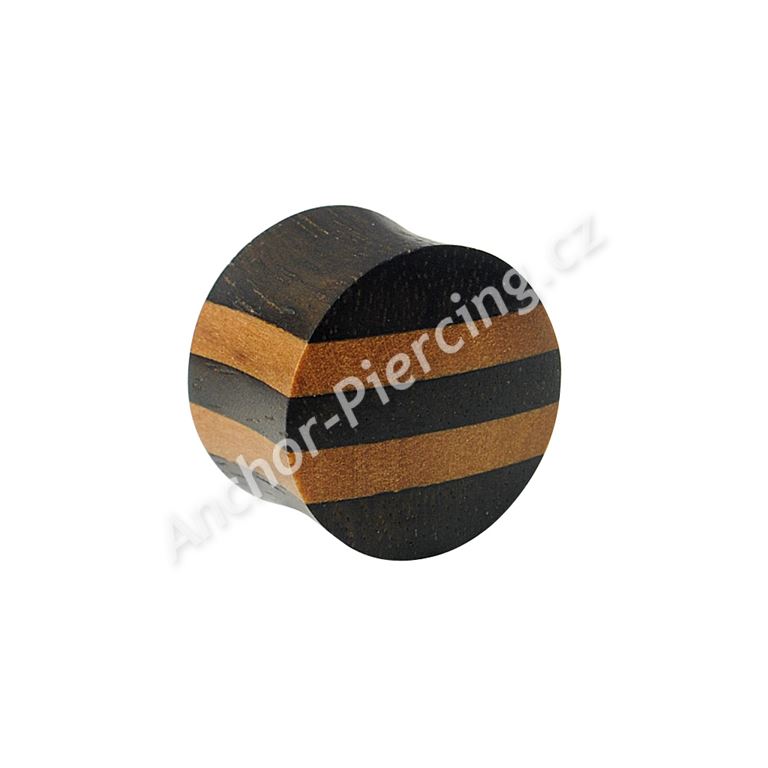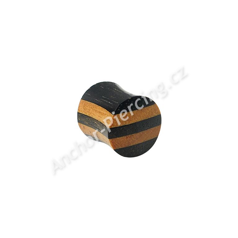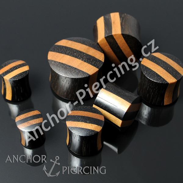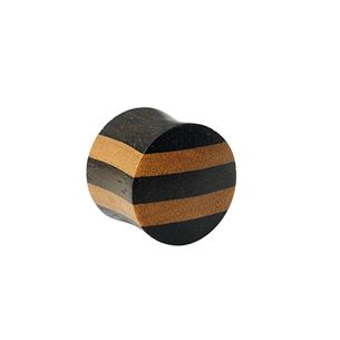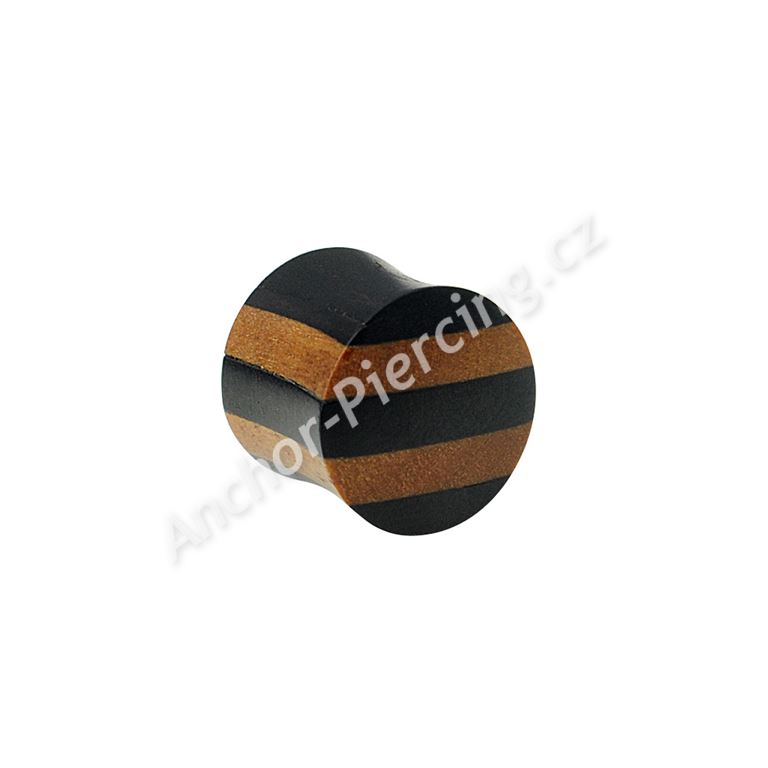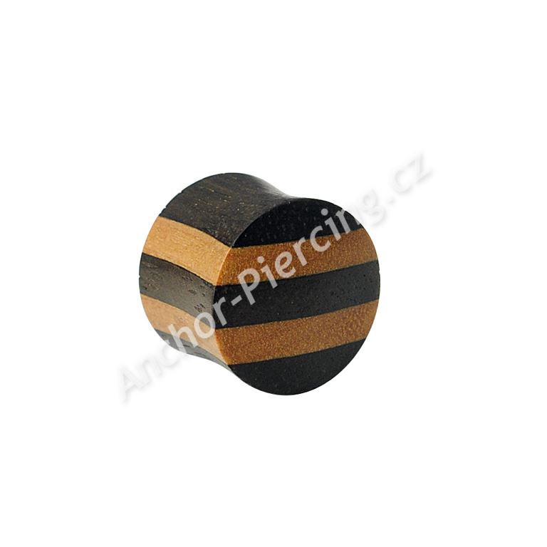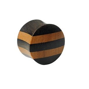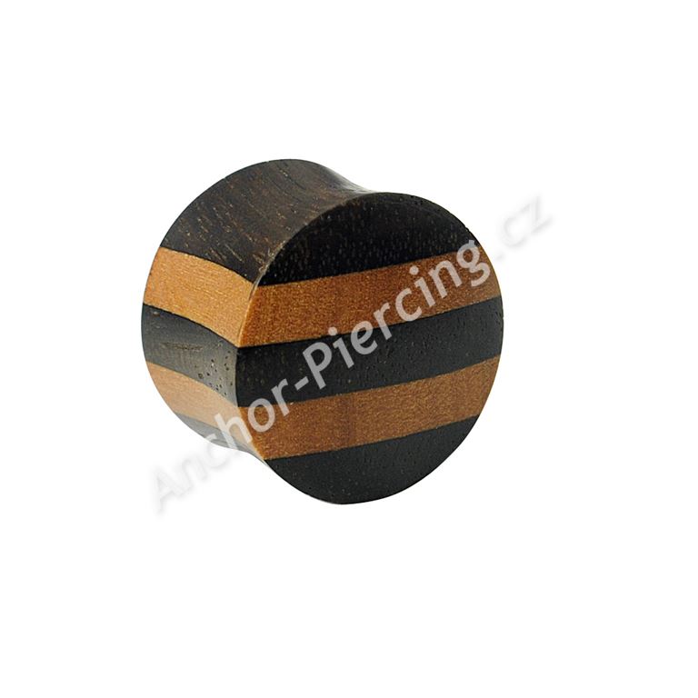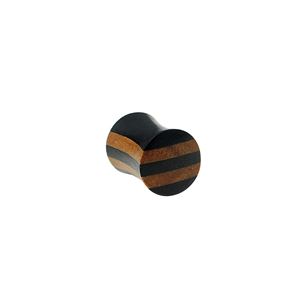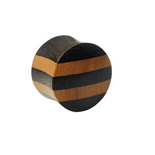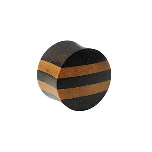 Dřevěný dvoubarevný plug. Díky jedinečné struktuře dřeva je každý kus originálem. Dřevěné plugy doporučujeme pravidelně vyndávat a čistit, oproti kovovým plugům se na nich však tvoří mnohem méně mazu a téměř nezapáchají. Ideální je pro jejich čištění používat vodu s mýdlem, poté nechat důkladně vysušit a namazat např. lněným olejem, nebo bílou lékařskou vazelínou. Není vhodné používat stejně jako u akrylu, nebo silikonu žádné alkoholové dezinfekce, neboť by mohlo dojít k poškození materiálu.
