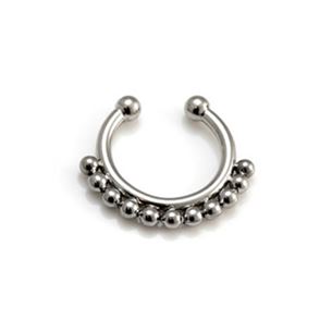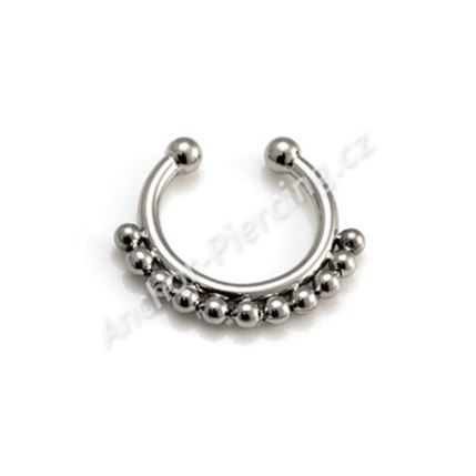 Falešný piercing do nosu zvaný septum. Nepotřebujete pro něj žádný vpich a jednoduše ho kdykoliv vyndáte. Přihnutím konců kroužku si jednoduše přizpůsobíte šperk pro pohodlné nošení.