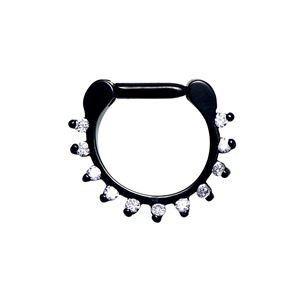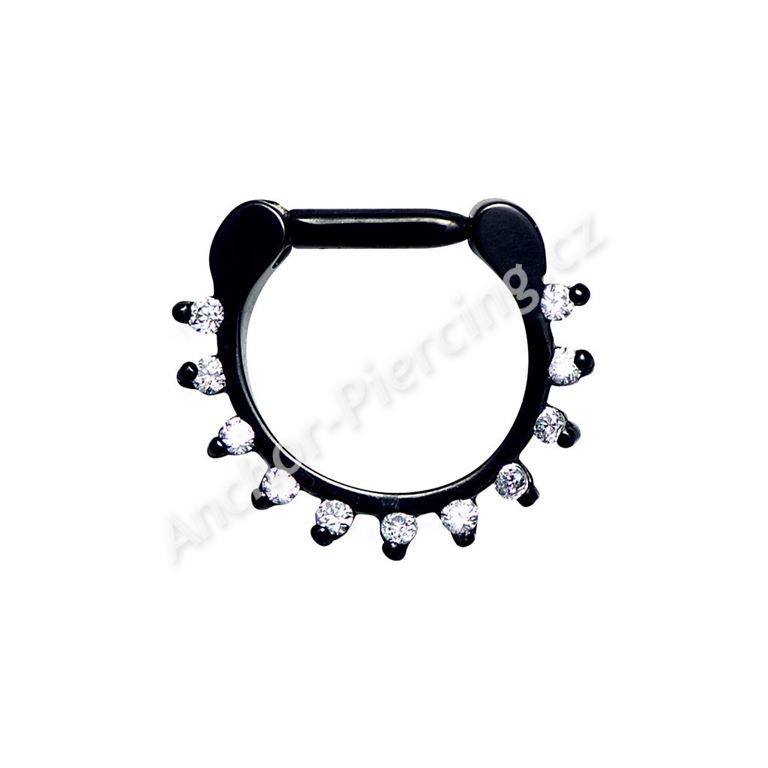 Piercing z chirurgické ocele 316L v černé povrchové úpravě s čirými kamínky od firmy Swarovski. Tento typ piercingu je určený pro piercing nosu, neboli septum. Výhodou tohoto kroužku je, že jej lze snadno otevřít a není potřeba použít piercingové kleště.