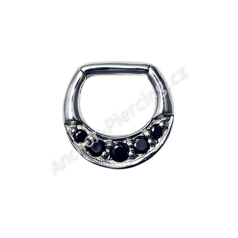 Piercing z chirurgické ocele 316L s kamínky Swarovski. Tento typ piercingu je určený pro piercing nosu, neboli septum. Výhodou tohoto kroužku je, že jej lze snadno otevřít a není potřeba použít piercingové kleště.