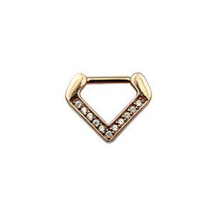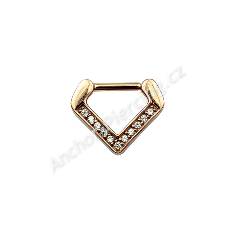 Septum do nosu v barvě růžového zlata, osázeno čirými kamínky. Velmi jednoduché nasazování pomocí klikacího patentu.